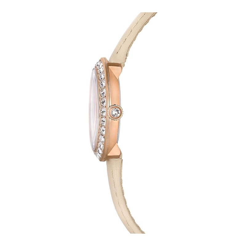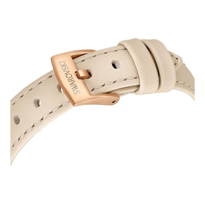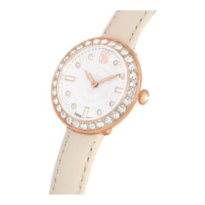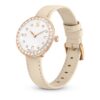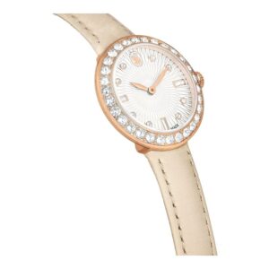 This Certa watch is a sublime fusion of artistry and performance. The round 30mm case is crafted in a beautiful rose gold-tone finish and features a bezel set with 30 pavé-set crystals. Beneath the mineral glass, a mesmerizing guilloché dial is revealed, featuring the Swarovski Swan logo at 12 o’clock, along with indexes crafted from round- and baguette-cut crystals. The watch’s crown also features a single pavé-set crystal. To add a touch of style to your wrist, the watch is fitted with a quick-release beige Italian leather strap with refined stitching. This Swiss-made timepiece is water-resistant to 50 meters and is designed to deliver punctuality and exquisite sophistication throughout your everyday life.