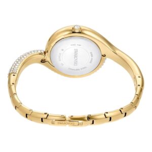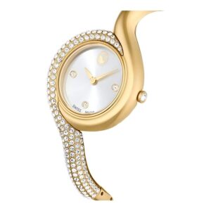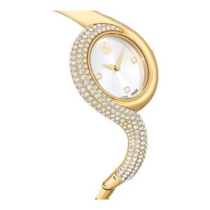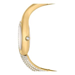 This captivating Dextera watch is inspired by classic vintage timepieces. The 29mm stainless steel design is finished in a gold tone and creatively adorned with clear crystal pavé on half the bezel and half the bracelet. Its minimalist dial features an iridescent effect and is accented only by three crystal hour markers and the swan logo at 12 o’clock. A total of 203 crystals were used in the creation of this timepiece, including the single crystal set in the crown. This Swiss-made timepiece is water-resistant to 50m and is a pure expression of Swarovski sophistication.