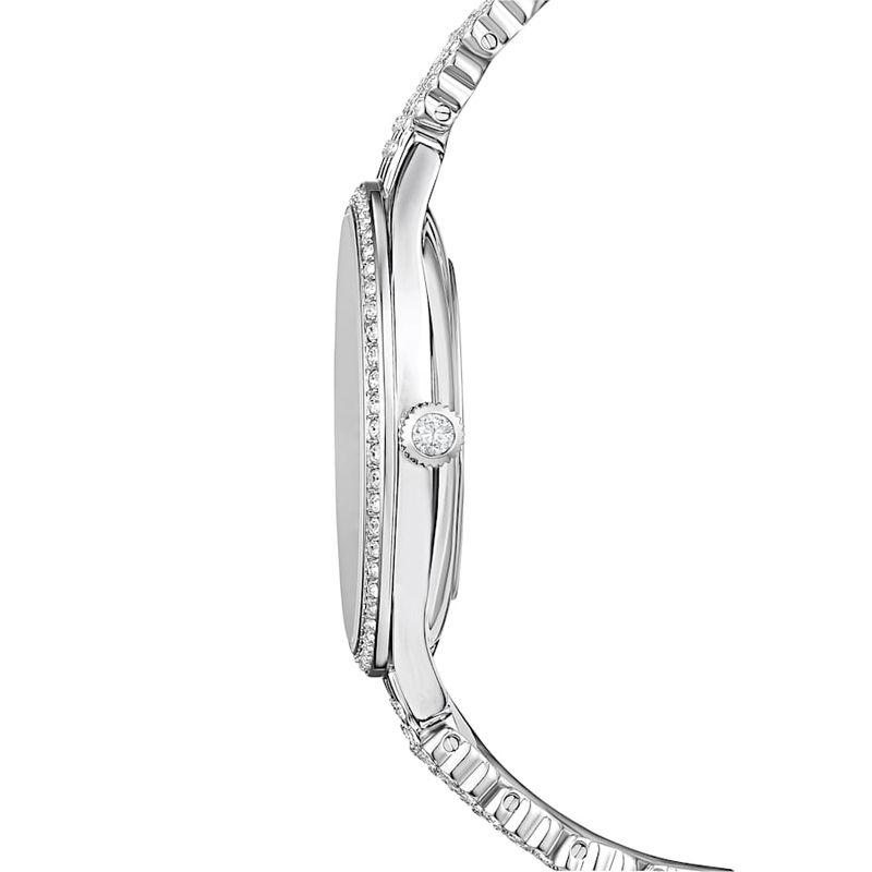 The simplicity of stainless steel is perfectly captured in this Swiss-made timepiece through the use of 433 crystals. The silver-tone guilloché dial features crystal index markers, while the slim bezel and bracelet feature dazzling clear pavé crystals. The 30mm watch is water-resistant to 50m and features a single stone in its crown. It’s designed to make a subtle yet dazzling statement with any outfit.