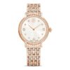 This Certa watch is a sublime fusion of artistry and performance. The round 30mm case is crafted in a beautiful rose gold-tone finish and features a bezel set with 30 pavé-set crystals. Beneath the mineral glass, a mesmerizing guilloché dial is revealed, featuring the Swarovski Swan logo at 12 o’clock, along with indexes crafted from round- and baguette-cut crystals. The watch’s crown also features a single pavé-set crystal. To add a touch of style to your wrist, the watch is fitted with a quick-release beige Italian leather strap with refined stitching. This Swiss-made timepiece is water-resistant to 50 meters and is designed to deliver punctuality and exquisite sophistication throughout your everyday life.