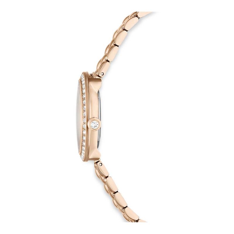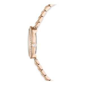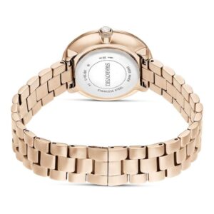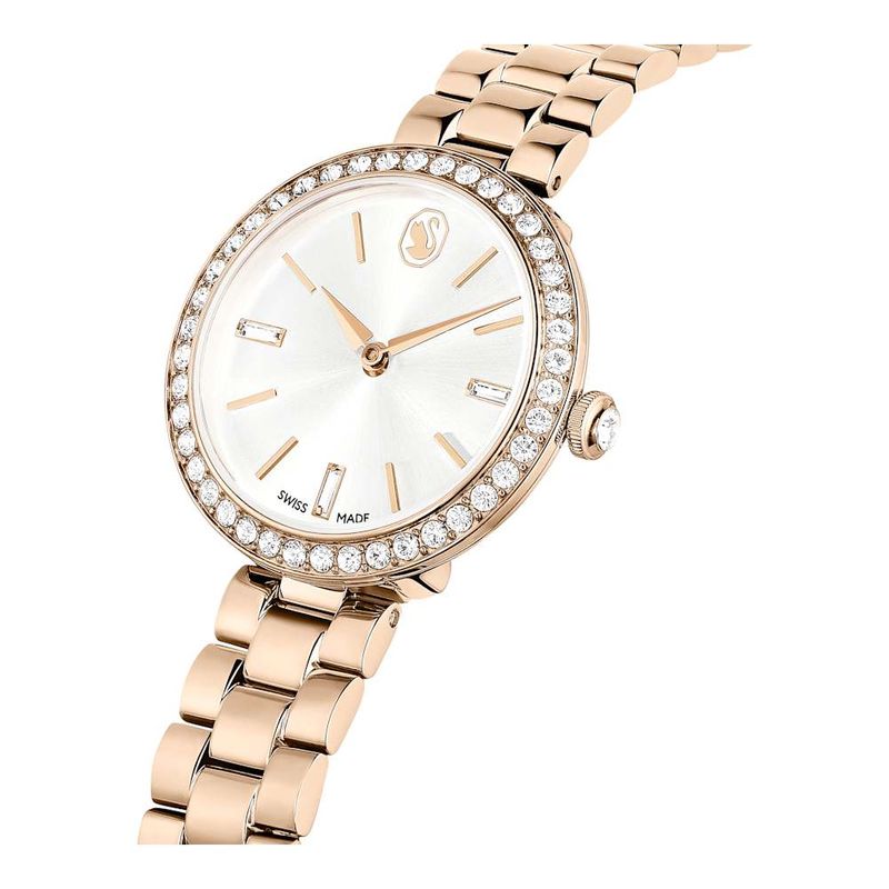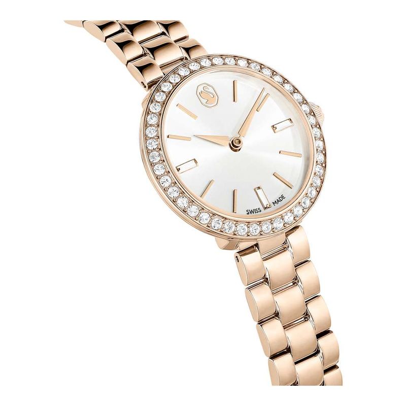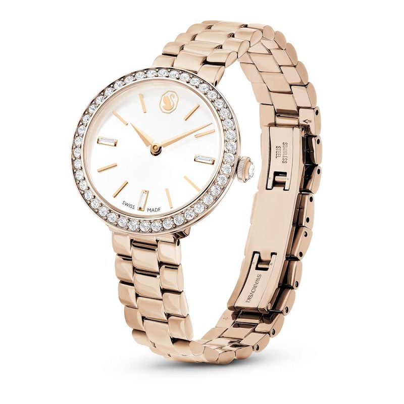 Blending Swarovski brilliance with contemporary design, the Certa watch is the perfect fusion of artistry and functionality. The 30mm stainless steel case has a warm champagne gold-tone finish and a bezel set with 42 shimmering pavé crystals. On the radiant iridescent dial, there’s an elegant swan logo at 12 o’clock, along with three index markers crafted with individual baguette-cut crystals. The crown is set with a single crystal, while the three-link metal bracelet comfortably fits the wrist. This Swiss Made watch is water-resistant to 50 meters and is a stylish choice to complement your everyday style.