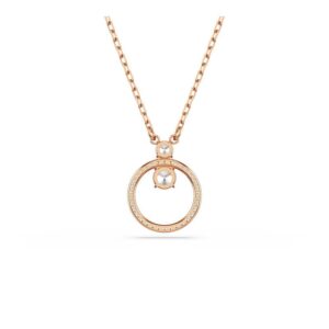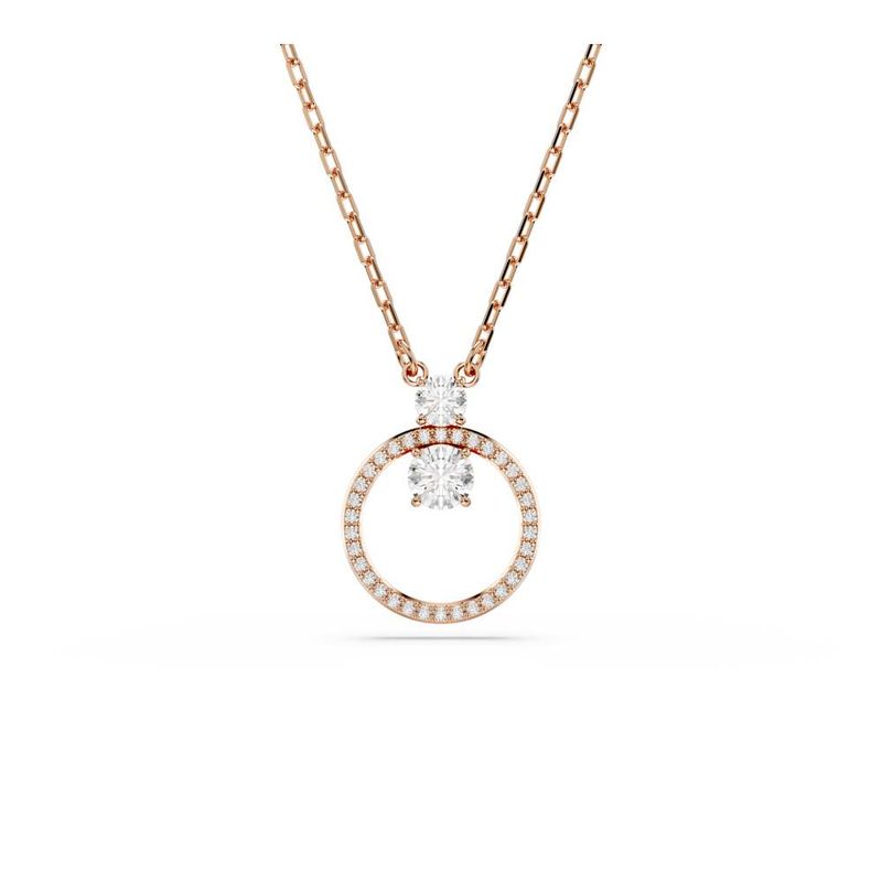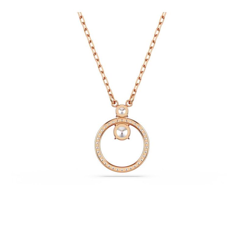 This rose gold-tone coated accessory is a modern take on the classic circle pendant and features a central ring of pavé-set clear Swarovski Zirconia, held by two larger claw-set Swarovski Zirconia. Dynamic yet elegant, this pendant can be worn alone or paired with the matching Dextera earrings.