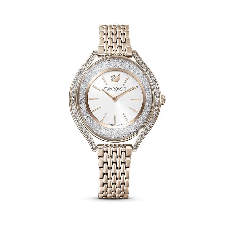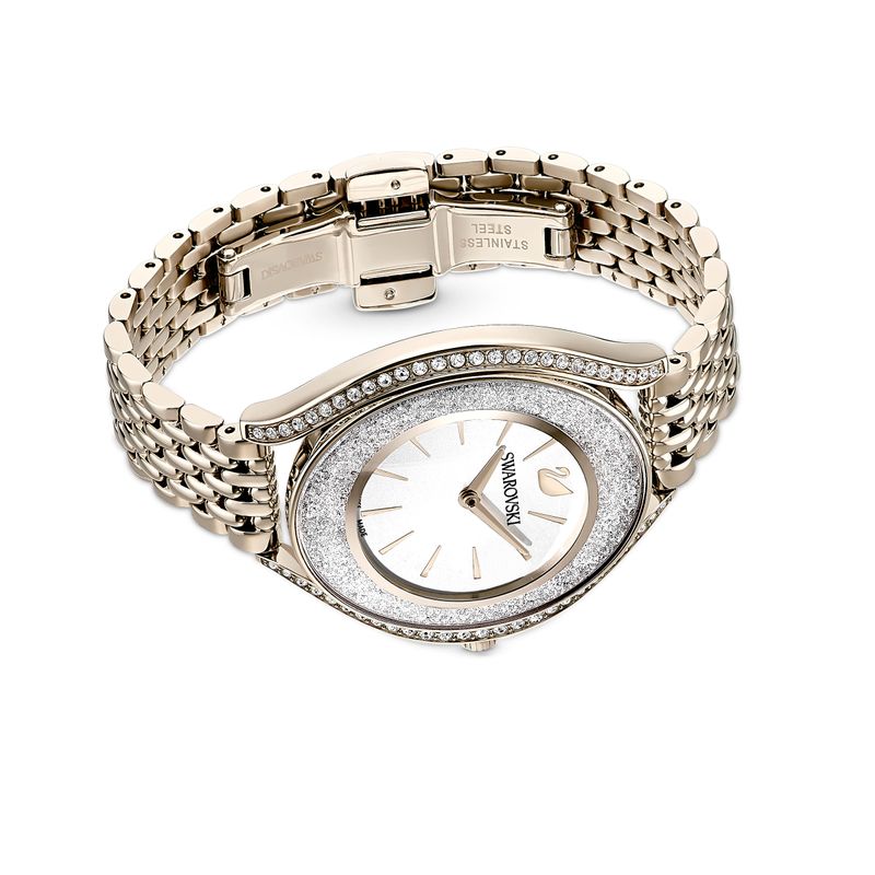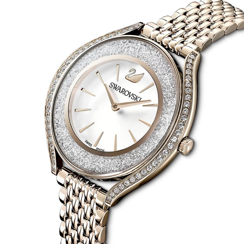 Incredibly elegant: This Swarovski watch from our Crystalline Aura Collection skillfully combines form and function. Over 1,300 crystals on the champagne gold PVD-coated case create a brilliant shimmering effect. A champagne gold PVD-coated bracelet and a silver-white dial with the Swarovski swan at 12 o’clock complete the sophisticated design. This Swiss Made watch is water-resistant to 50 m.