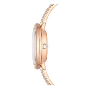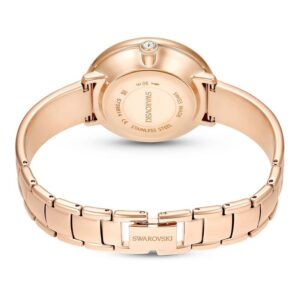 Something between an accessory and a timepiece, this Crystalline Bangle watch is a brilliant everyday accessory. The 32mm stainless steel design is finished in rose gold and is held in place on the wrist by an adjustable bracelet featuring an elegant beige enameled midsection. In a sublime example of Swarovski’s Crystalline technique, the dial is decorated with approximately 1,016 crystals, which sparkle between the slim hour markers and the swan logo at 12 o’clock. An additional crystal has also been placed in the crown. This Swiss-made watch is water-resistant to 50m and offers dazzling style no matter the time of day.