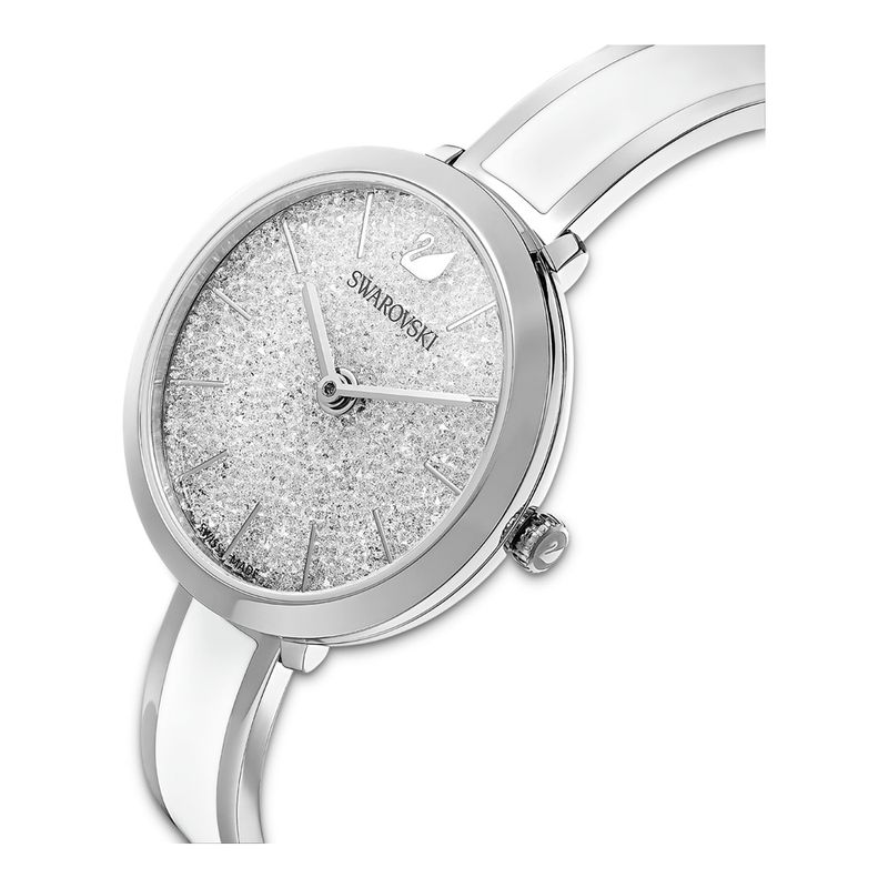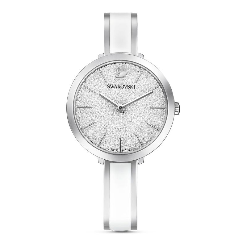 This comfortable and sophisticated Swarovski bracelet watch stands out with its iconic Crystalline brilliance. Its modern dial and elegant stainless steel case, filled with approximately 1,000 clear crystals, sparkle with pure brilliance. The jewelry-inspired bracelet, also crafted from stainless steel, features a minimalist, glossy white enamel finish. Swiss-made and water-resistant to 50 m, the watch is the perfect accessory to style this season and beyond. Adjustable links ensure a perfect fit for any wrist.