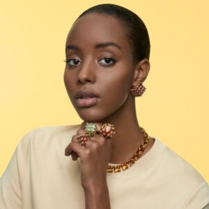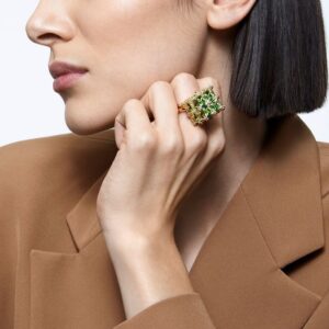 This three-dimensional cocktail ring is inspired by the miracle and elegance of geometry. Square princess-cut “bichromatic” green crystals are adorned with delicate clear stones and set on a gold-plated double band. Wear it alone to draw attention to yourself, or combine it with other rings in the Curiosa family to create a novel evening piece. Part of the Curiosa family, this ring was designed by Creative Director Giovanna Engelbert for Collection I.