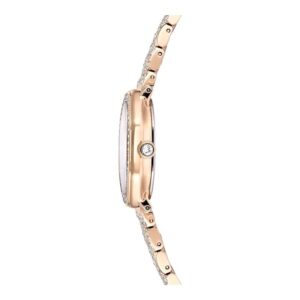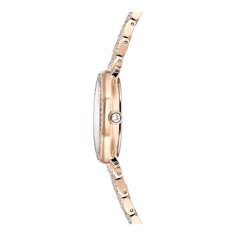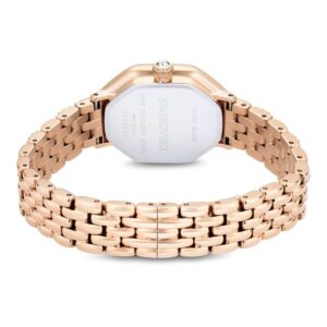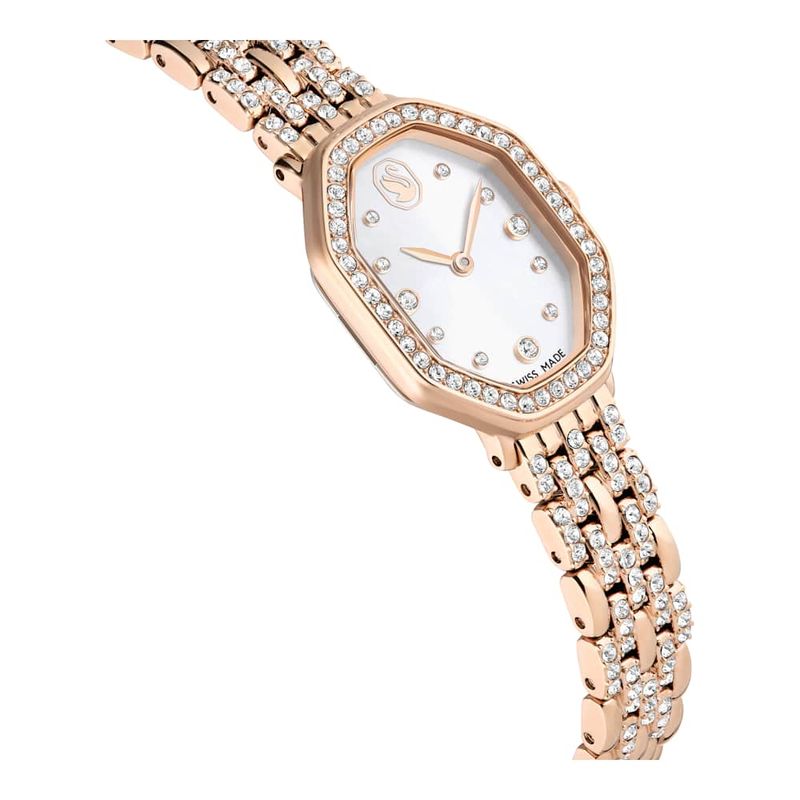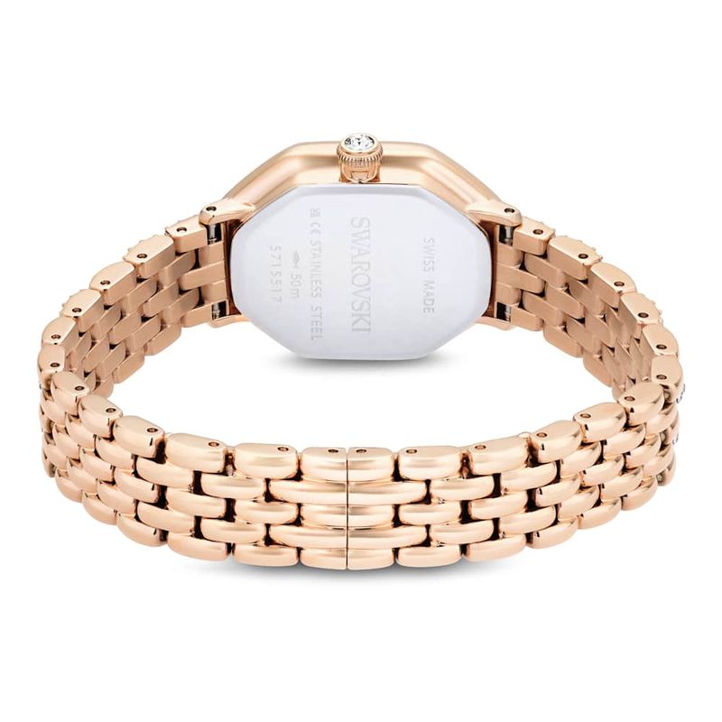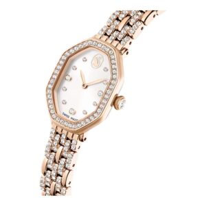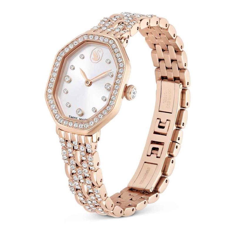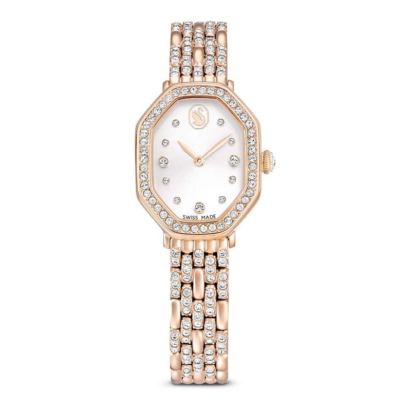 Inspired by the timeless elegance of the Dextera family, this 18 x 23 mm watch is uniquely crafted in Swarovski’s iconic octagonal shape. Crafted from stainless steel with a rose gold-tone finish, this design features a bezel studded with 46 pavé-set crystals and an additional crystal set in the crown. The iridescent dial also includes delicate crystal indexes, along with slim hands and a swan logo at 12 o’clock. To complete this radiant creation, the five-link bracelet is adorned with 108 round-cut crystals, bringing endless sparkle to every hour. This Swiss-made watch is water-resistant to 50 m.