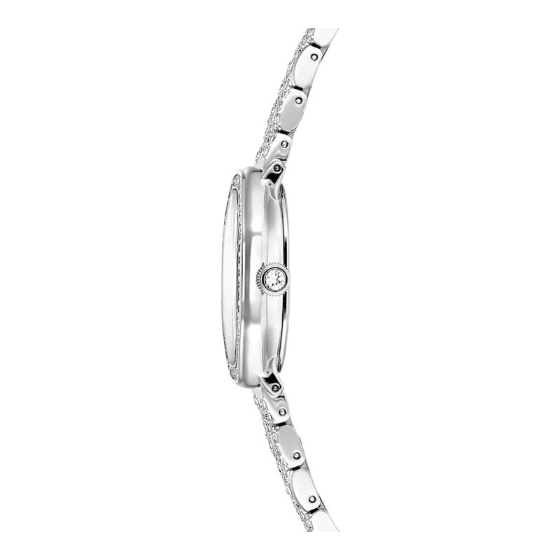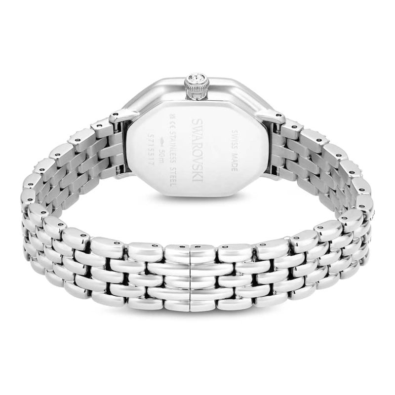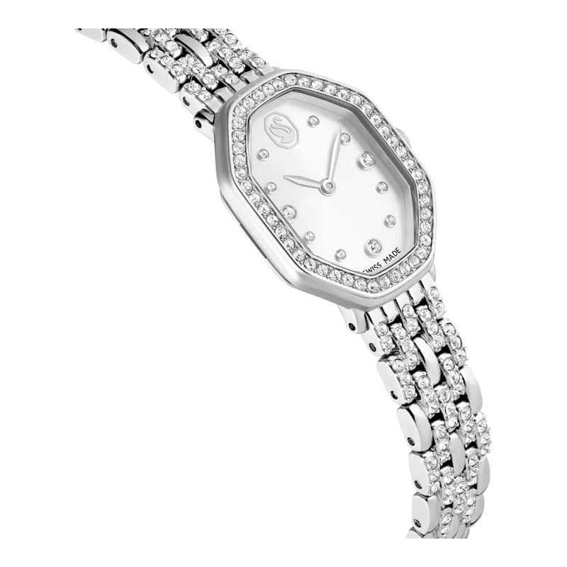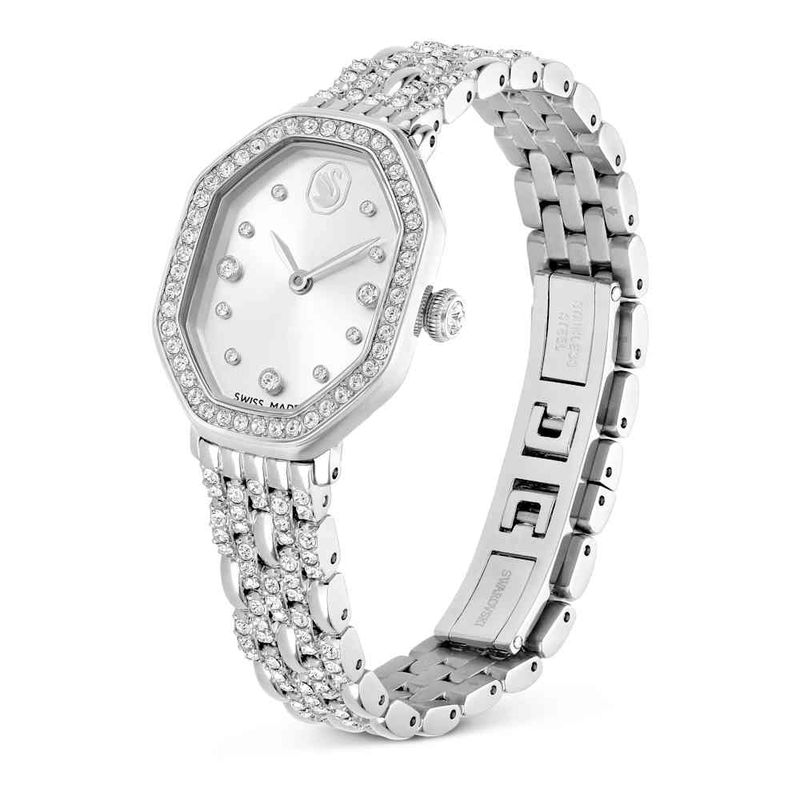 Inspired by the timeless elegance of the Dextera family, this 18 x 23 mm watch is uniquely crafted in Swarovski’s iconic octagonal shape. This stainless steel design features a bezel set with 46 pavé-set crystals and an additional crystal set in the crown. The iridescent dial also includes delicate crystal indexes, along with slim hands and a swan logo at 12 o’clock. To complete this radiant creation, the five-link bracelet is adorned with 108 round-cut crystals, bringing infinite sparkle to every hour. This Swiss-made watch is water-resistant to 50 m.