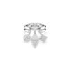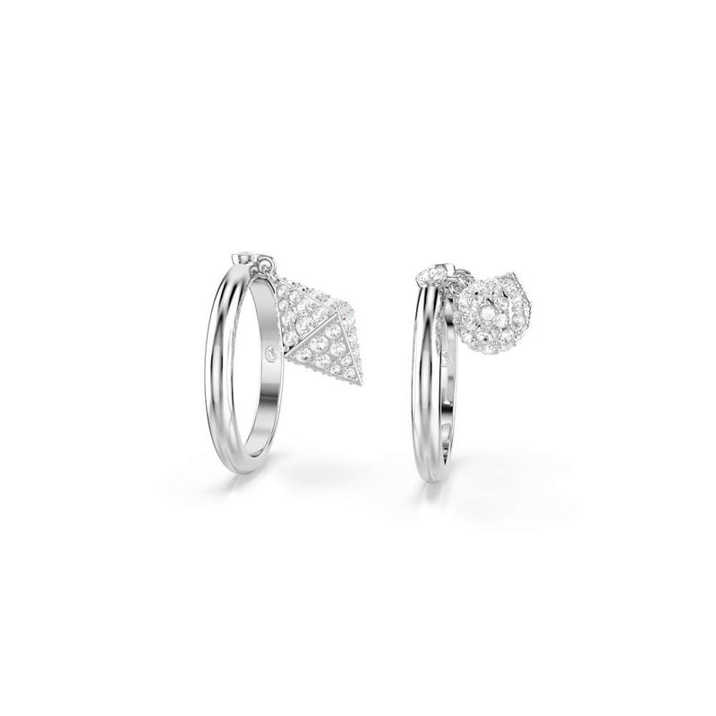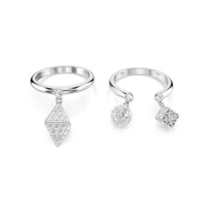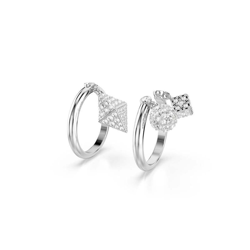 This multifaceted ring set features creative shapes that dazzle with their unique designs. The open band features a sphere and cube, as well as individual crystals placed at each end, while the second band is enhanced with a triangular motif. Both pieces are rhodium-plated and their embellishments are enhanced with crystals of varying cuts set in separate pavé settings. Wear them together for true geometric glamour.
