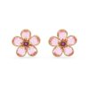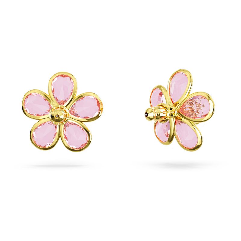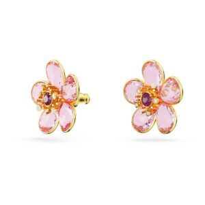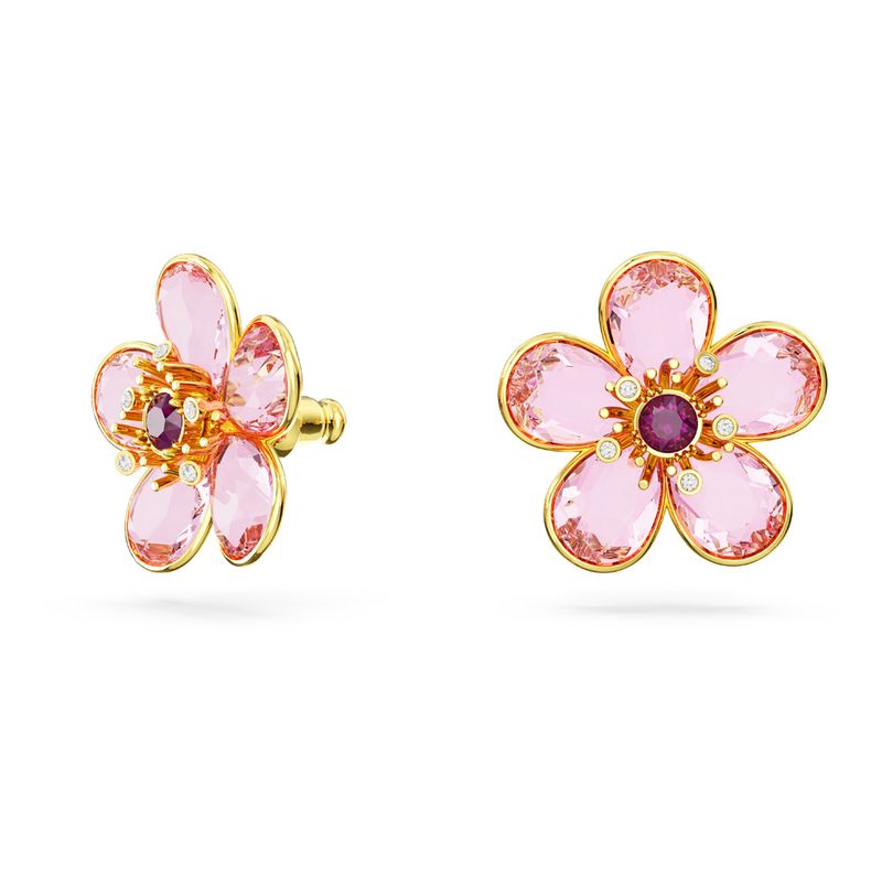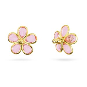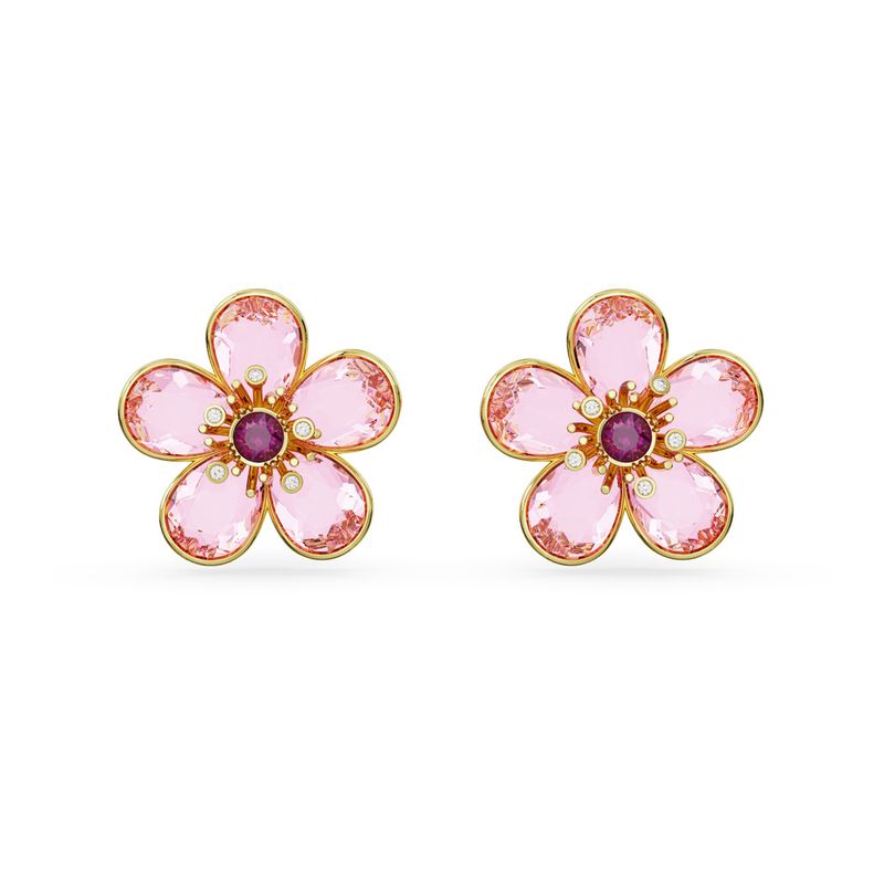 These stunning earrings are inspired by the wondrous beauty of nature and sparkle with the elegance of crystals. Set in a gold plating, the pink design features five petals arranged around a darker center stone. A captivating design for those fresh, floral days.