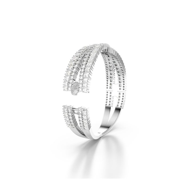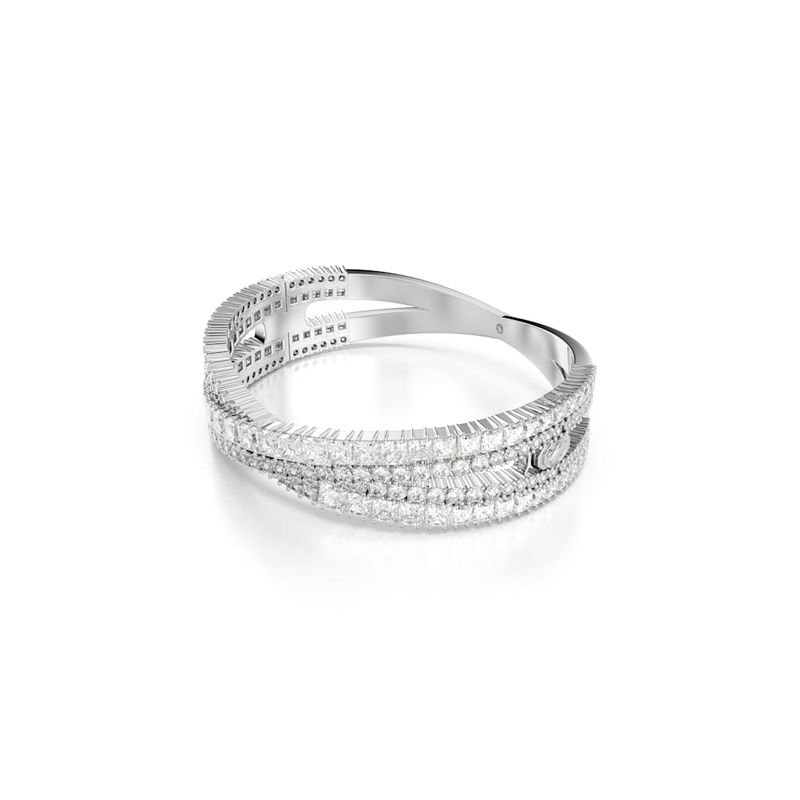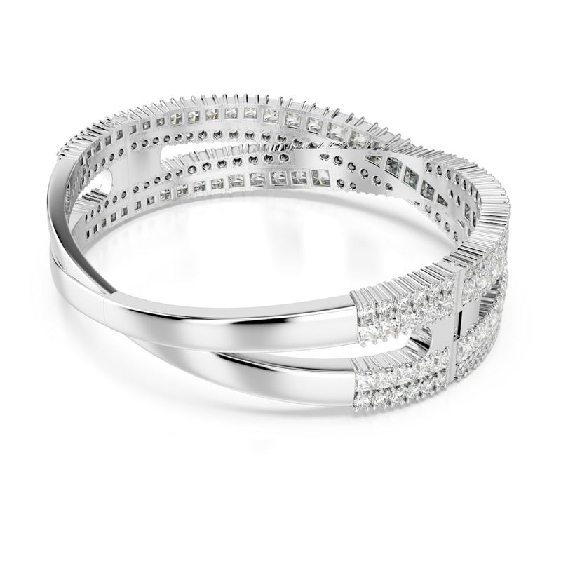 Inspired by the timeless infinity motif, this Hyperbola closed bracelet offers lasting brilliance. This rhodium-plated accessory features an intricate split-hinged design that spirals around your wrist with a cluster of clear Swarovski Zirconia crystals in mixed cuts. Expertly crafted with incredible detail, this piece will add a touch of luxury to your style.