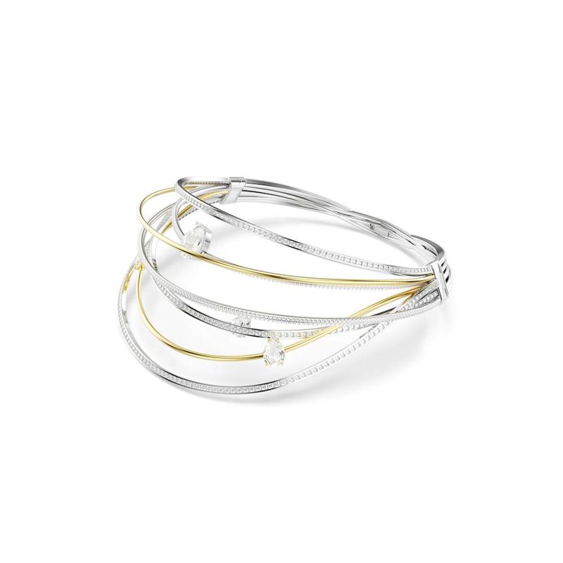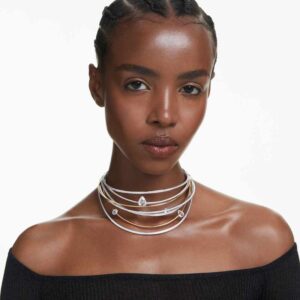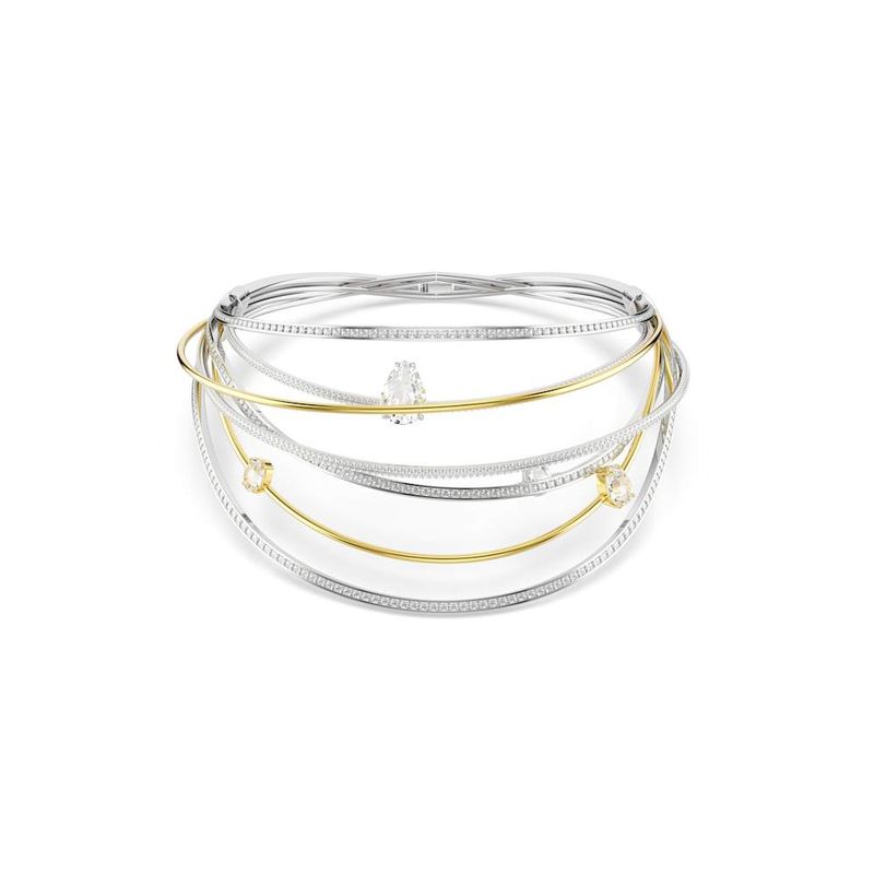 This mesmerizing Hyperbola choker comes to life with a burst of light and creativity. The mesmerizing design is crafted from multiple rhodium-plated and gold-tone bands, featuring clear Swarovski Zirconia in channel and claw settings. Clear crystals are placed between the bands for added impact. Pair this intricate accessory with a matching bracelet for a look full of luminous glamour.