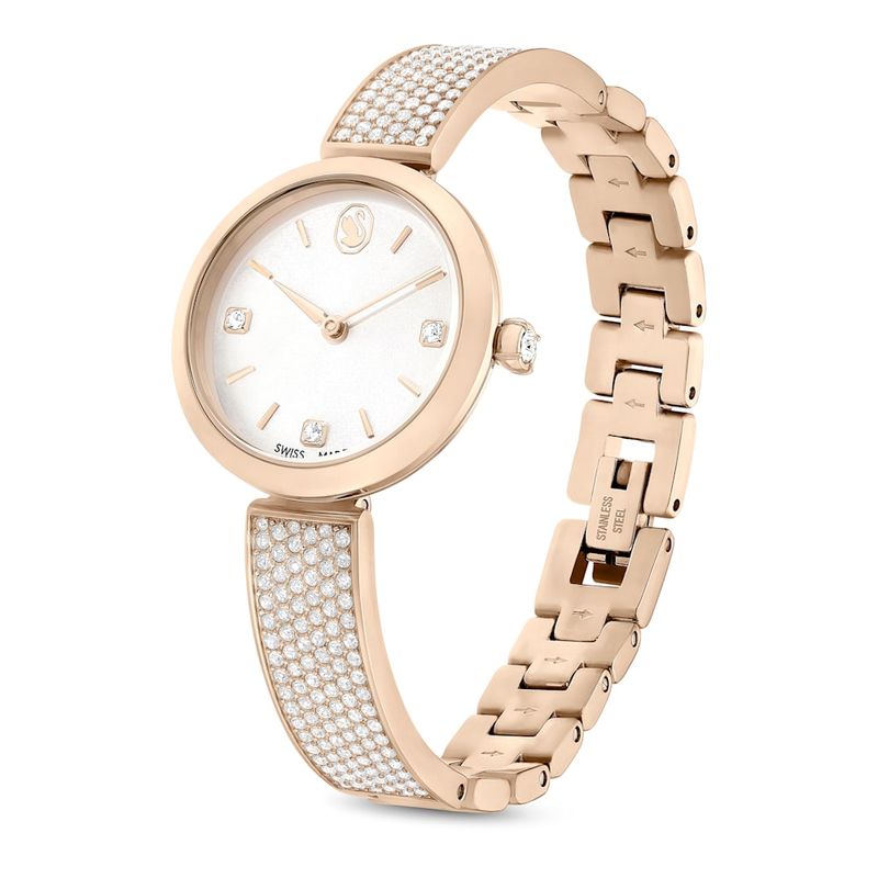 Illumina watches are designed to bring sensational beauty to your wrist. This 27mm model features a champagne gold-tone finish and an adjustable bracelet delicately adorned with 210 clear crystals. Beneath the mineral glass, the iridescent dial features the swan logo at 12 o’clock and three square crystals as index markers. This Swiss-made watch features a single crystal on the crown, is water-resistant to 50m, and is designed to keep you on time with a light-catching sparkle, day or night.