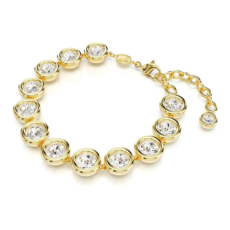 This Imber bracelet will encircle your wrist with luminous joy to elevate any outfit. This gold-tone coated design features a full strand of round-cut crystals in a domed bezel setting and is completed with a lobster clasp closure. A great choice for casual wear or to enhance an evening look.