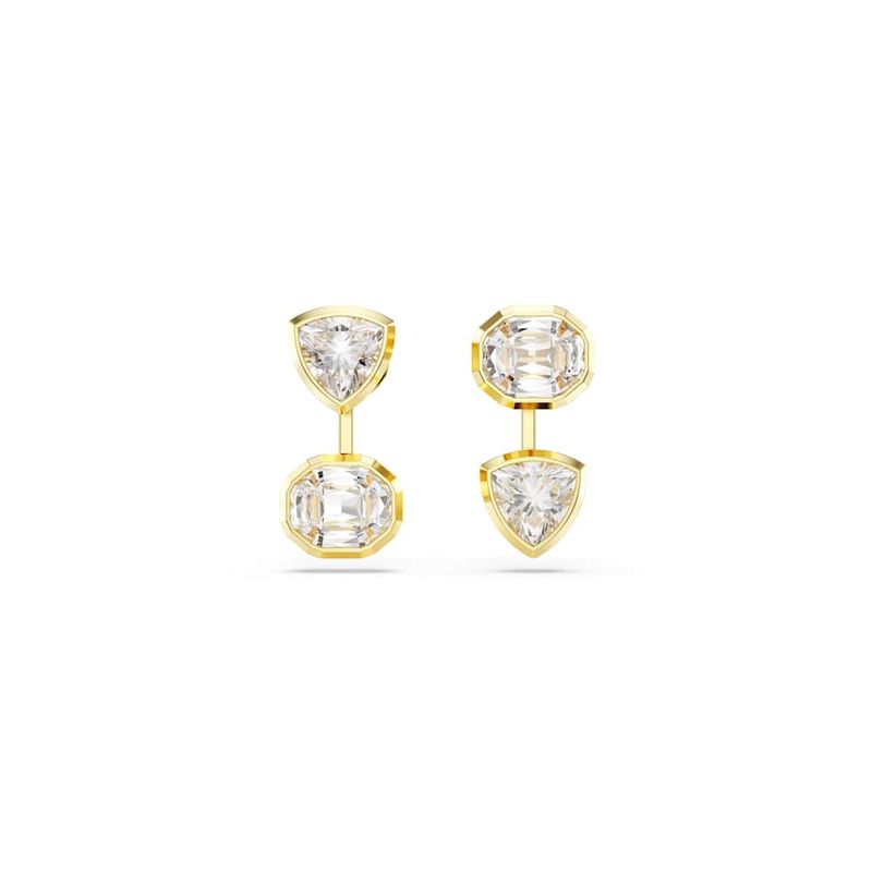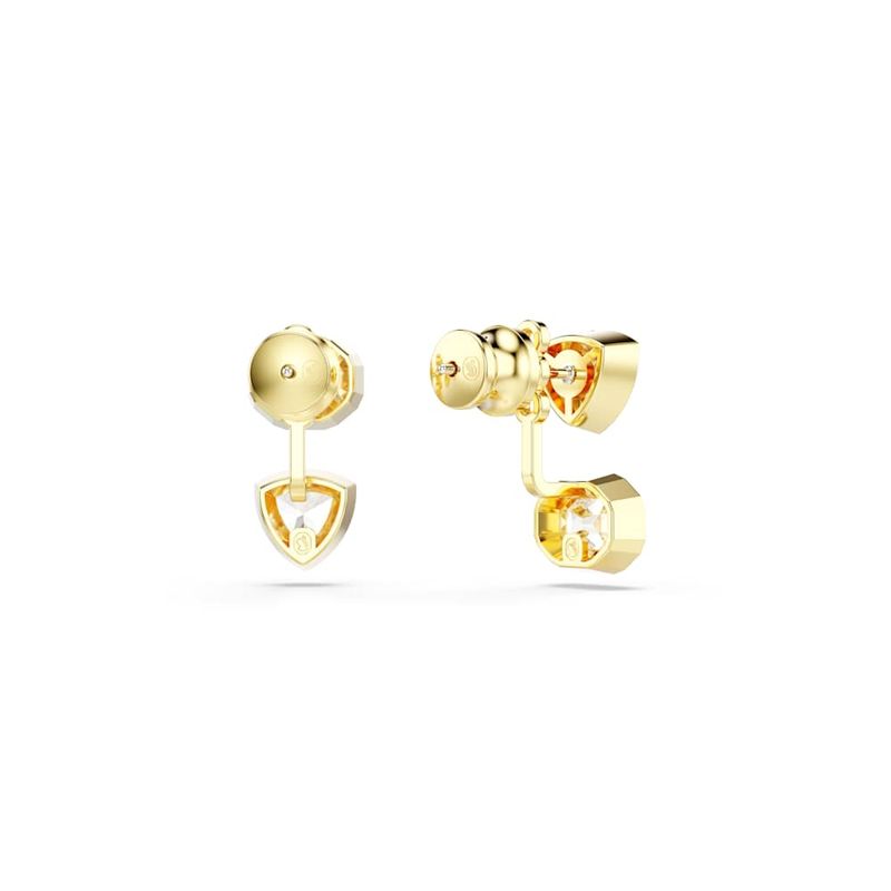 Combining geometry with light, these intriguing and eye-catching earrings are gold-tone plated and feature a pair of trillion-cut and octagon-cut Swarovski Zirconia stones on each earring charm. The clear stones are held in a modern bezel setting, and for an asymmetrical touch, their position is reversed on each side. Wear these earrings with a matching necklace and add a touch of sparkle to your everyday look.