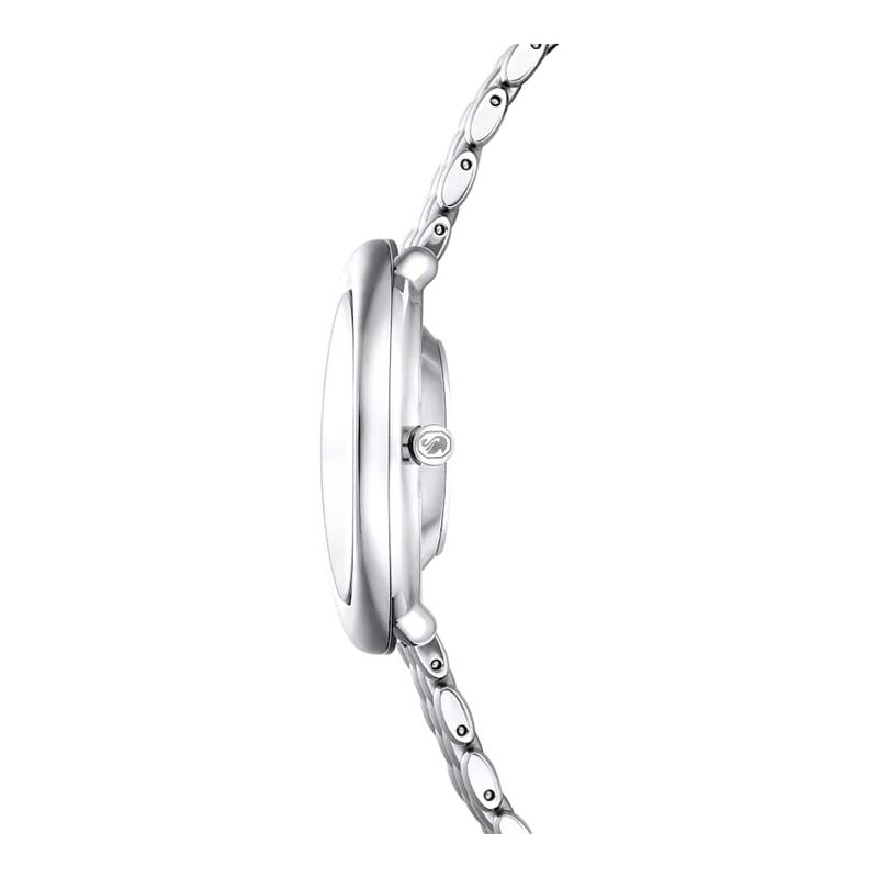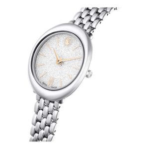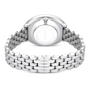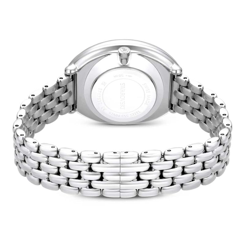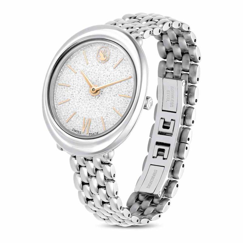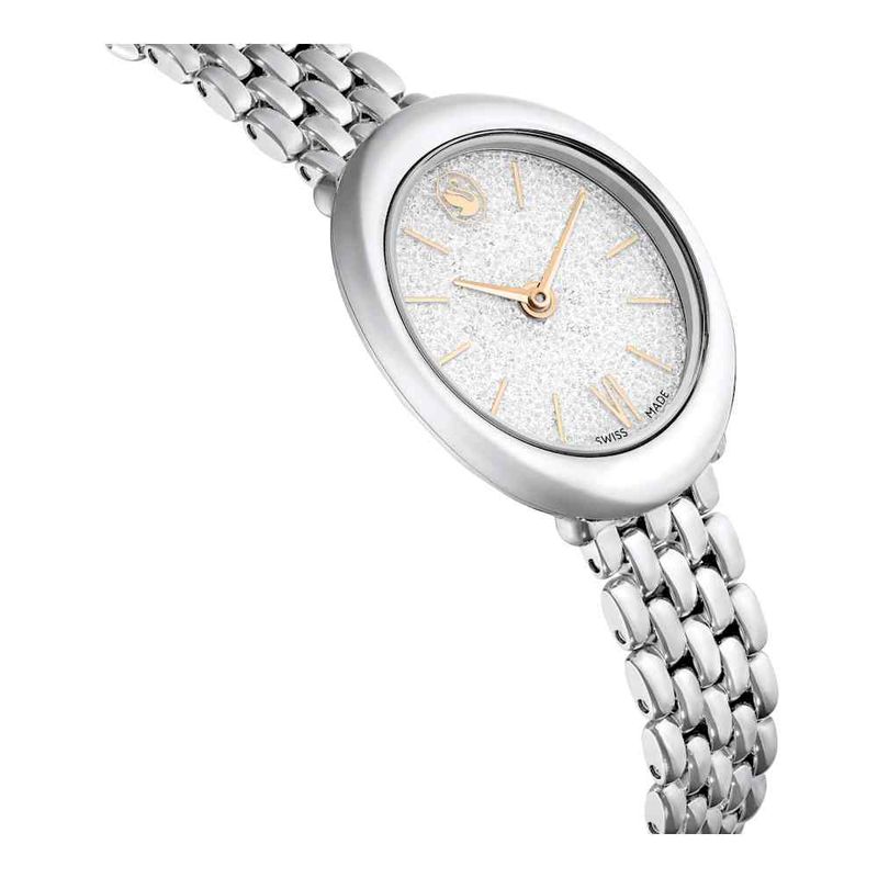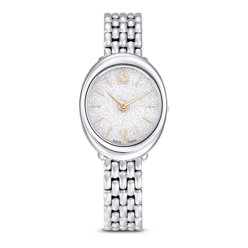 The Imber Oval watch conveys a modern approach to watchmaking through its lustrous dial and timeless elliptical shape. This 24 x 26.3 mm version is crafted from stainless steel and features around 1,000 clear crystals on its Crystalline dial. Additional details are finished in gold-tone, including the hour markers and hands, as well as the unique Roman numeral at 6 o’clock and the iconic Swarovski swan logo at 12 o’clock. The Swiss-made watch features a polished metal bracelet and is water-resistant to 50 m. Make this your go-to choice for sophisticated day-to-night style.