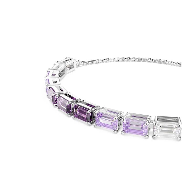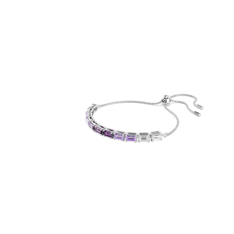 Swarovski’s creative flair shines through in this playful and vibrant bracelet. Crafted with a rhodium-plated finish, the design features a sliding clasp and adorned with a row of octagonal, step-cut Swarovski Zirconia stones, each secured in a prong setting and presented in a gradation of shades from clear to purple. Perfect for layering with other bracelets to tell your own style story.