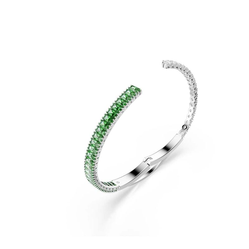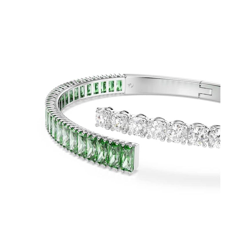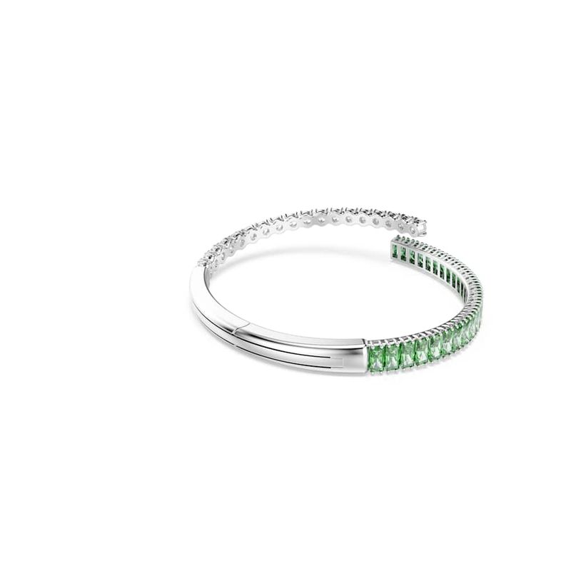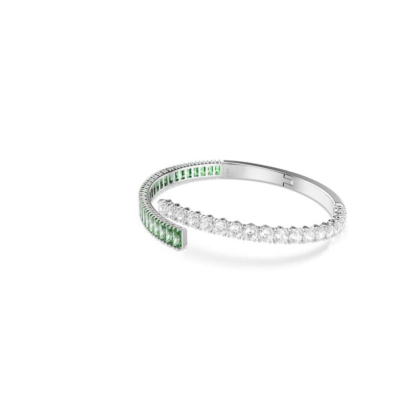 Colorful, energetic, and expressive, this Matrix bracelet is a playful way to complement your style. The layered band is rhodium-plated and features clear and green Swarovski Zirconia in round and baguette cuts. A vibrant choice that pairs perfectly with the matching ring and earrings.