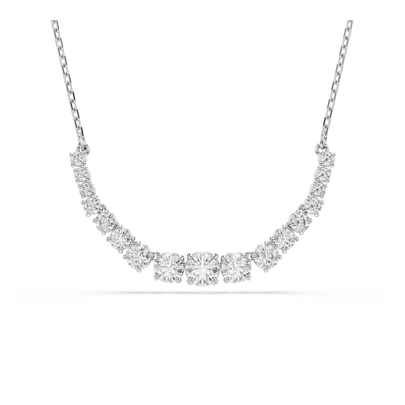 Embrace a statement of pure elegance with this radiant Matrix necklace. This rhodium-plated design features a delicate chain adorned with a gradient of round-cut Swarovski Zirconia, each carved to reflect the light beautifully. Pair this necklace with a matching set of earrings or a bracelet to enhance its luxury.