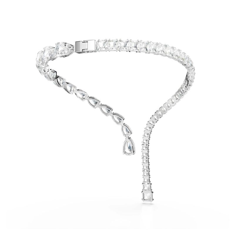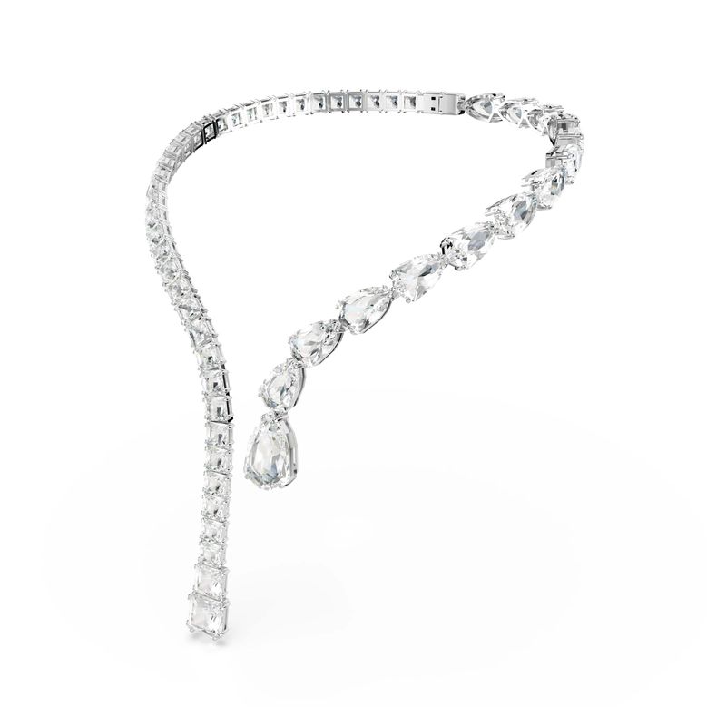 With its graceful curves and all-over sparkle, this Matrix necklace is the perfect statement piece. This rhodium-plated design is embellished with an array of pear-cut and square-cut clear crystals in various sizes that add unexpected dimension to the finished silhouette. Choose this piece for an instant touch of opulence and glamour.