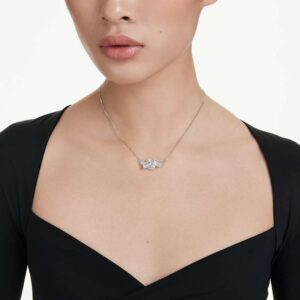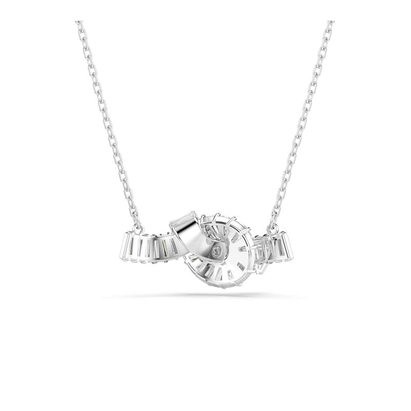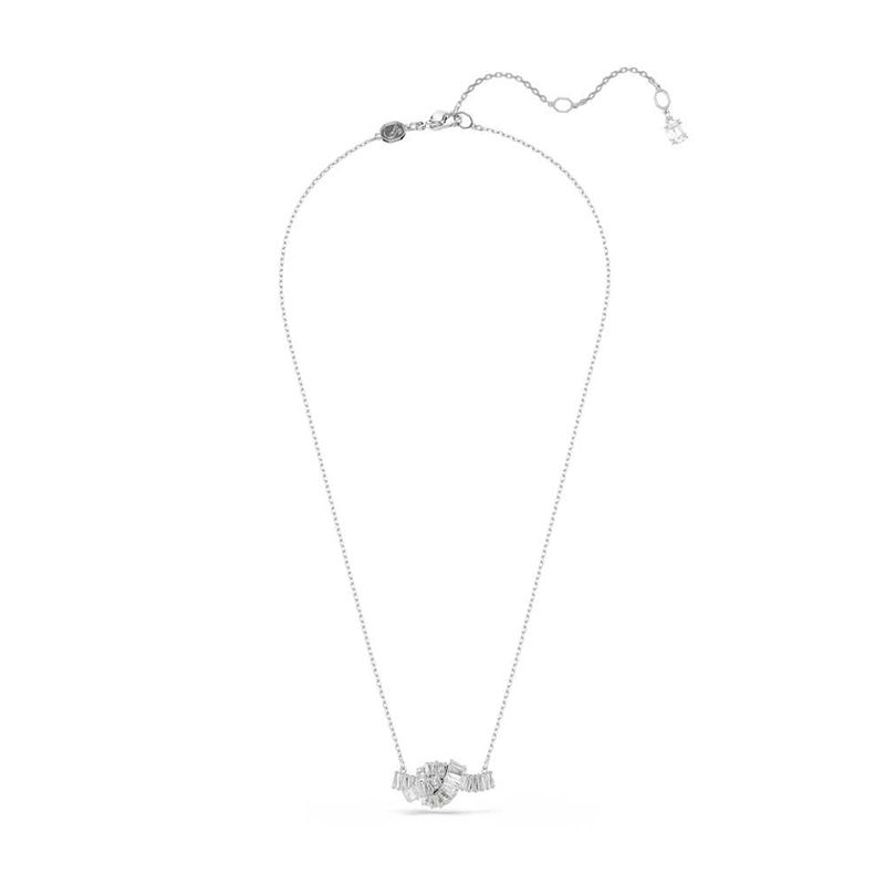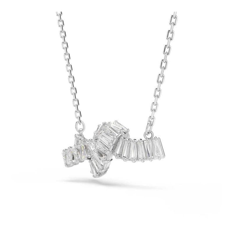 This elegant Swarovski pendant features a knot to symbolize an eternal connection. Suspended from a delicate chain, the ribbon-inspired motif is rhodium-plated and decorated with sophisticated baguette-cut Swarovski Zirconia, each claw-set. This is a sophisticated everyday accessory that pairs perfectly with other Matrix creations.