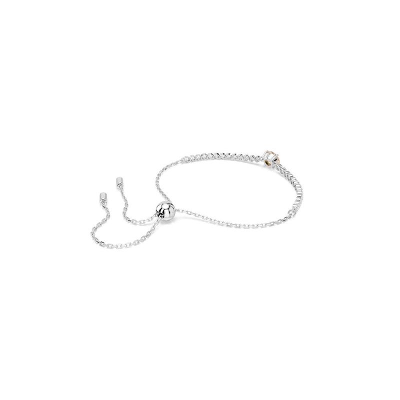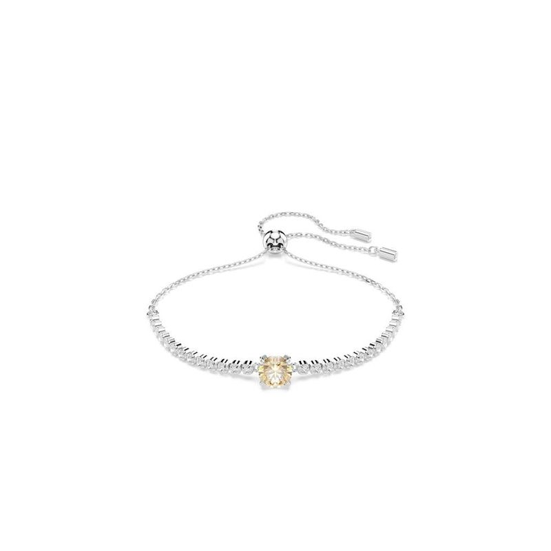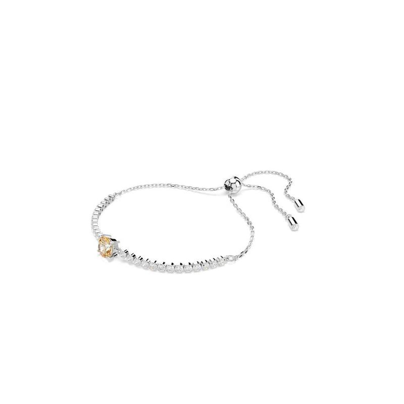This Matrix bracelet is a new take on the classic tennis bracelet, combining clear Swarovski Zirconias with a bright pop of color. Fastening with a sliding clasp, this rhodium-plated accessory features a uniform row of clear Swarovski Zirconias and a round-cut Champagne-colored Swarovski Zirconia in the center for a pop of color. A bright and vibrant piece that’s perfect for enhancing any look.