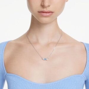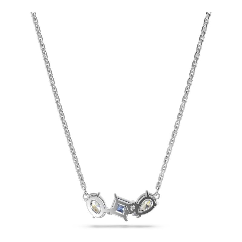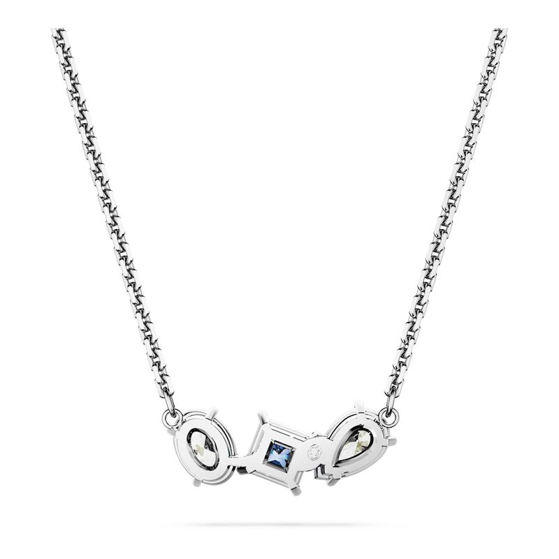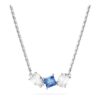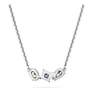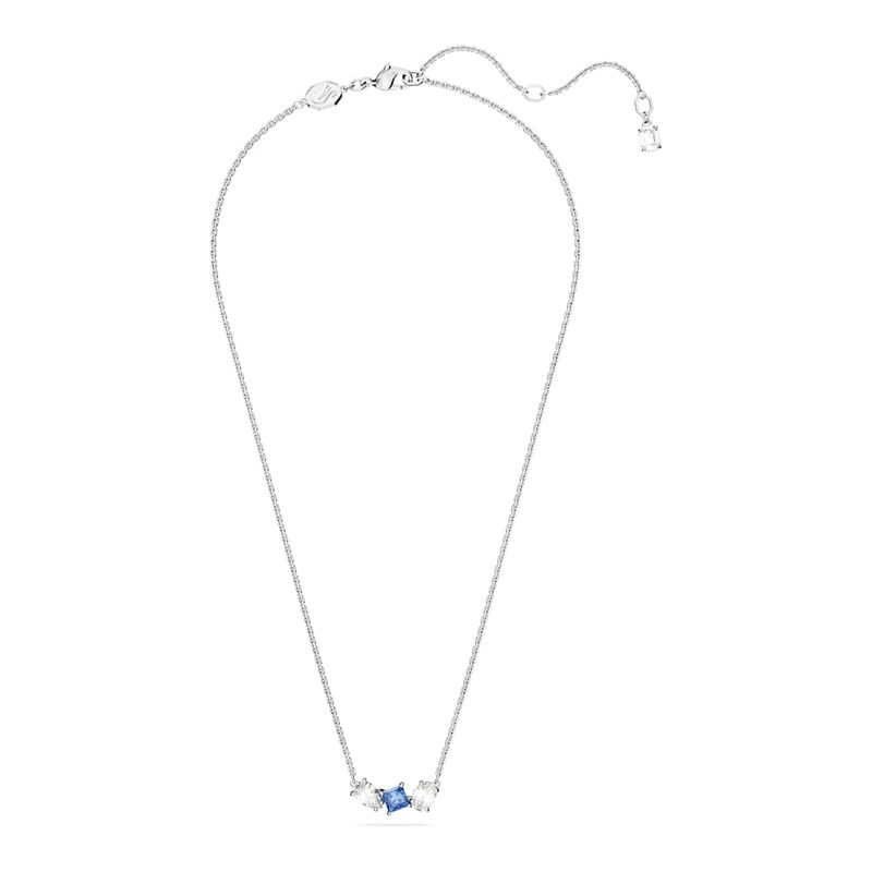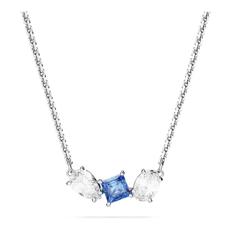 This elegant Mesmera pendant is a stylish and exquisite piece thanks to its bold combination of cuts and colors. Hanging from a delicate chain, the rhodium-plated design features a trio of Swarovski Zirconia prong-set in different shapes with a radiant blue center stone. A wonderful gift that will enhance any outfit.