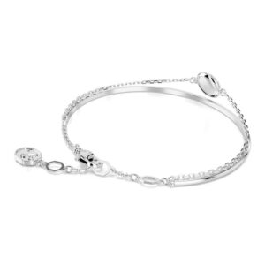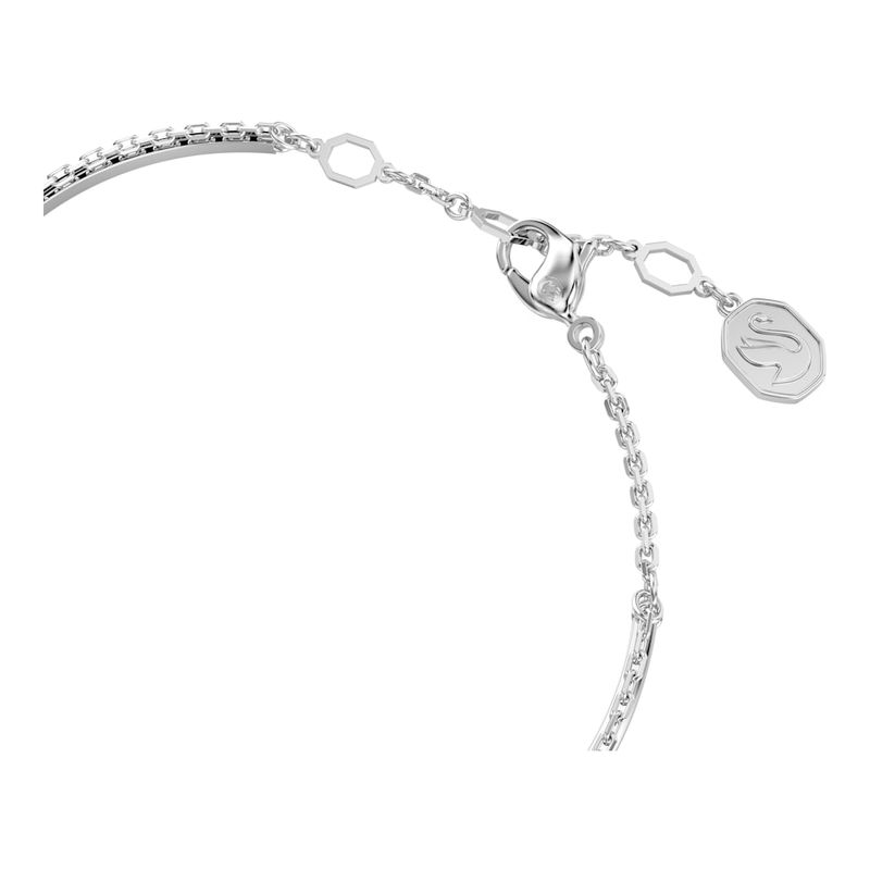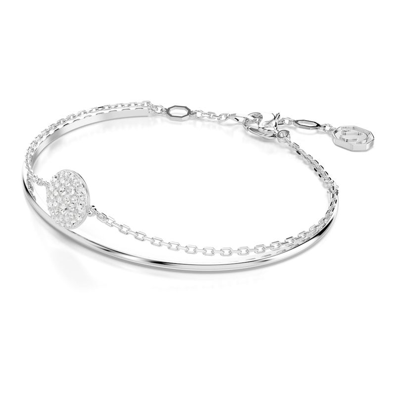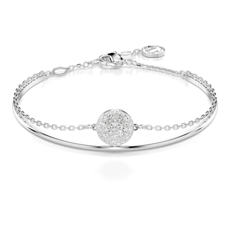This starry bracelet is a tribute to the cosmos and bursting with joy that catches the light. The rhodium-plated design, which wraps around the wrist, features a rigid band alongside a delicate chain with a domed meteor motif. It’s beautifully embellished with round clear crystals of varying sizes in snow pavé. Pair this bracelet with a matching pendant to enhance any outfit.