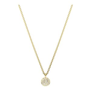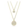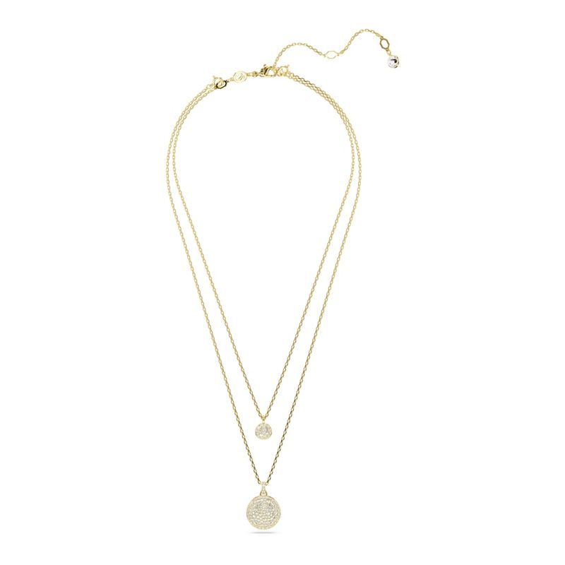 This sparkling layered pendant is the perfect way to brighten your look. The gold-tone coated design features two chains, each featuring a domed meteor motif beautifully embellished with different-sized clear round crystals set in snow pavé. For added versatility, the pendant can be worn on its reverse side, showcasing a halo of crystals around the larger motif and a single crystal in the center of the smaller motif. A wonderful gift for yourself or someone special.