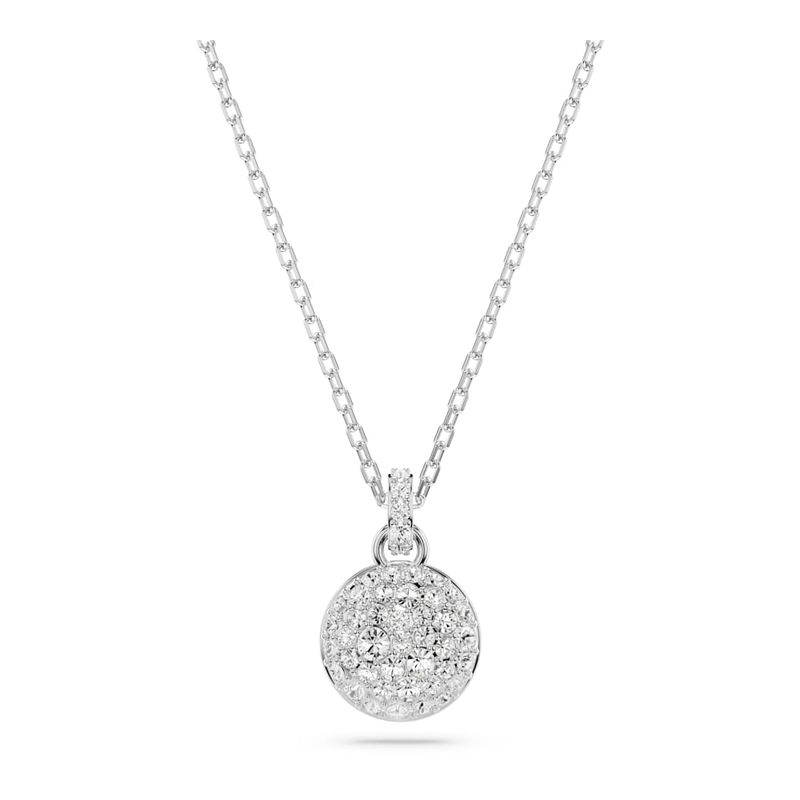This galaxy-inspired pendant will add a dazzling impact to any look. The rhodium-plated design features a delicate chain with a lobster clasp and a beautifully domed meteor motif adorned with clear round crystals in varying sizes set in snow pavé. Wear it as a wonderful piece of joy that catches the light.