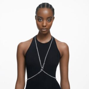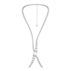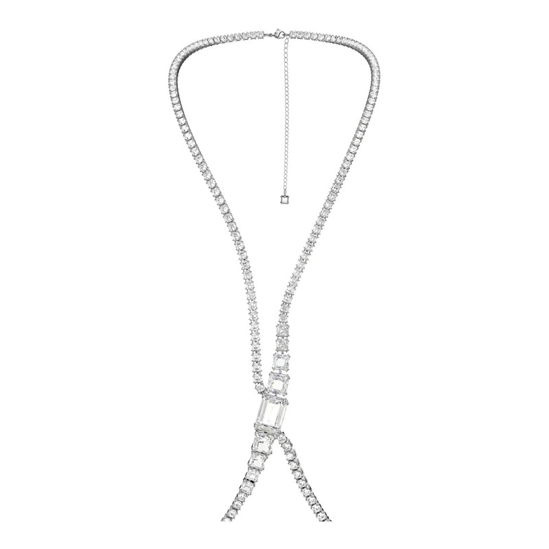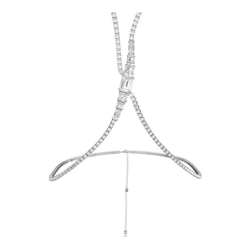This Millenia family body chain is the accessory you need to add a dramatic touch to any look. Designed with dazzling rows of rhodium-plated square-cut crystals, this unique creation swoops across the body in a style that catches the light from every angle. Wear it with monochromatic looks and shine brightly. The strand with the oversized center stones measures 72.5 cm (28.5 inches). The other measures 71 cm (28 inches). This piece has a 10 cm (4 inch) extension at the back of the neck.