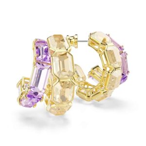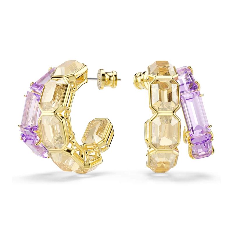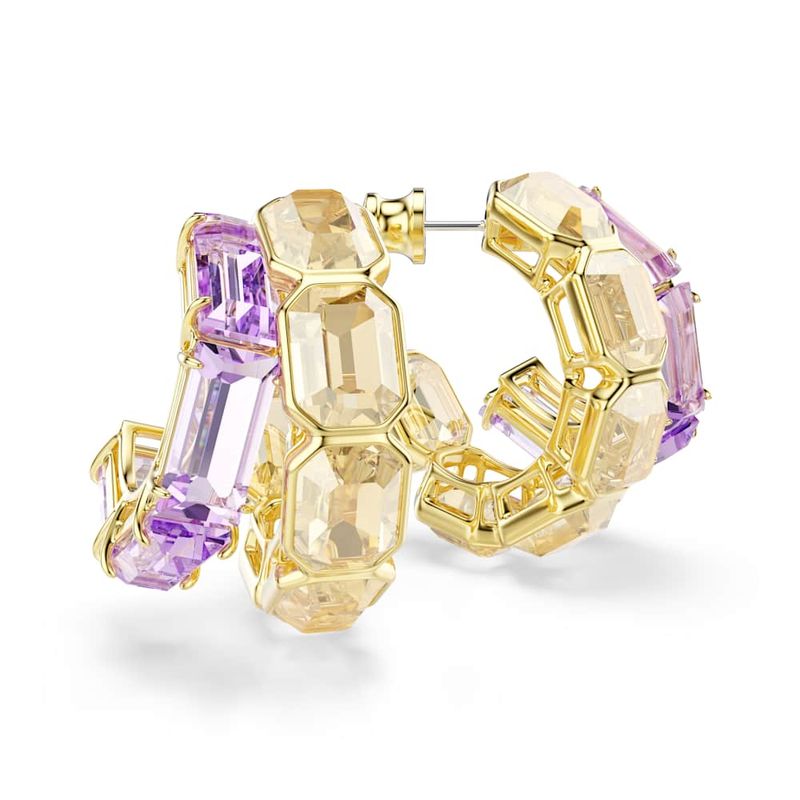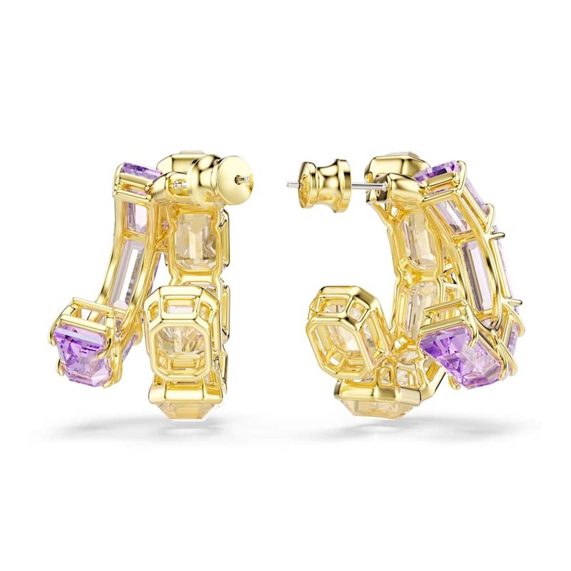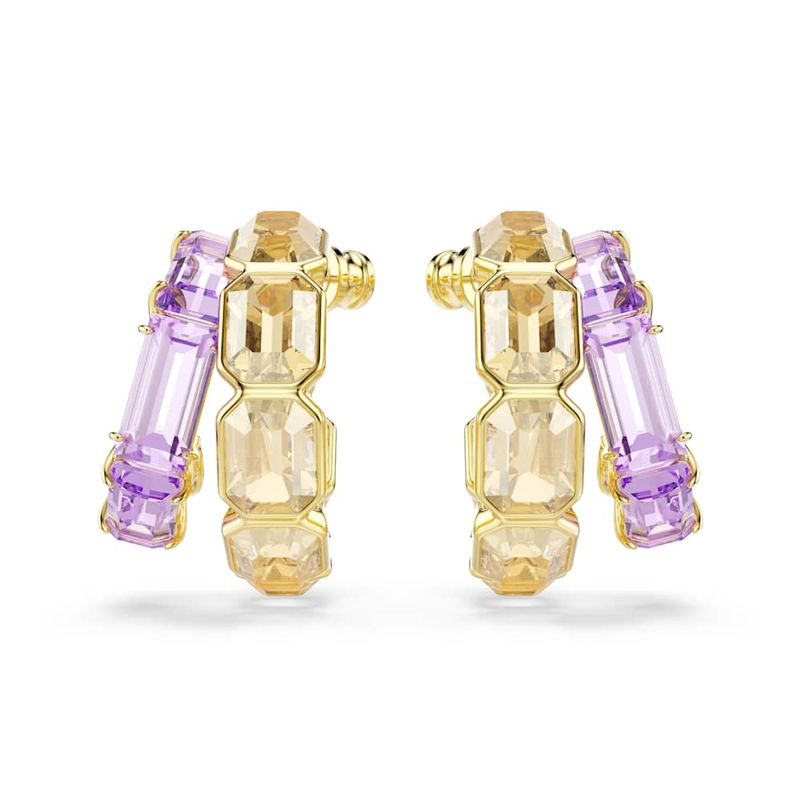 These multi-colored earrings are the perfect choice for total glamour. Each gold-tone plated piece features two asymmetrical mini hoops, each with octagonal candy-colored crystals in a bezel setting and purple crystals in a claw setting. A beautiful mix of contrasts that come together to create a bold look. Wear these earrings with matching pieces from the same family to accentuate the effect.