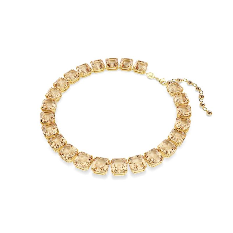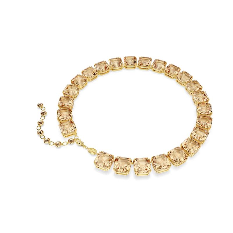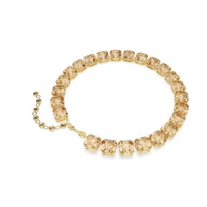 Look strikingly luxurious with the vibrant hues of this Millenia necklace. The gold-tone plated style is designed to catch the light from every angle with an articulated row of Asscher-cut crystals in a warm caramel hue. Each section showcases Swarovski’s mastery of double-claw setting, and the piece is completed with a lobster clasp closure and ornate extension. Treat yourself or a loved one.