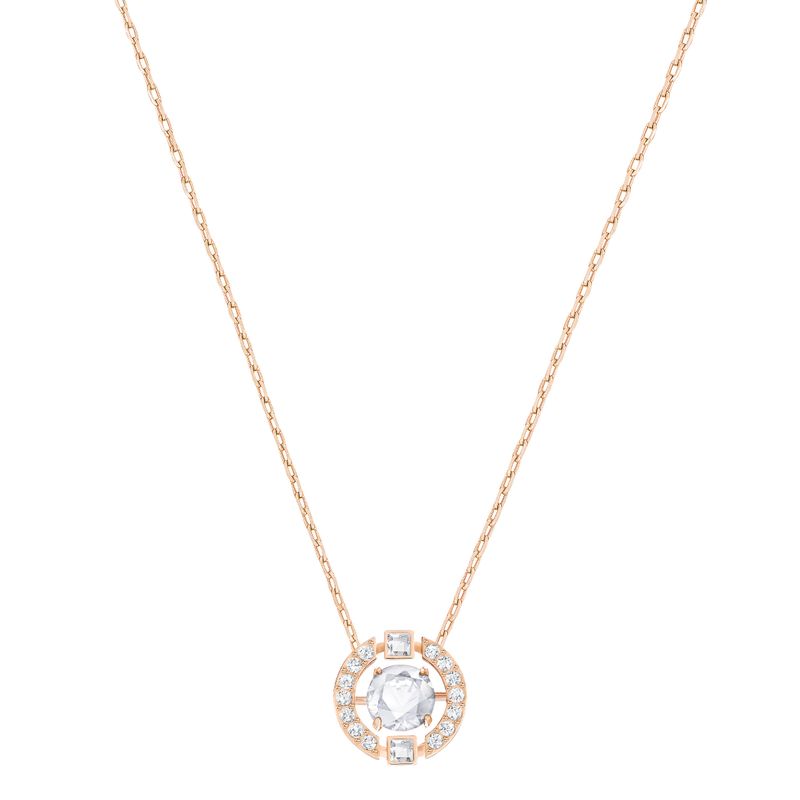 Inspired by a new ‘moving crystal’ design concept, this rose gold-plated necklace features a round stone floating within a three-dimensional crystal pavé structure. A must-have addition to any personal collection, it will add a touch of everyday style and a cheerful glow.