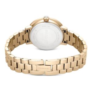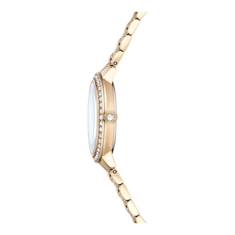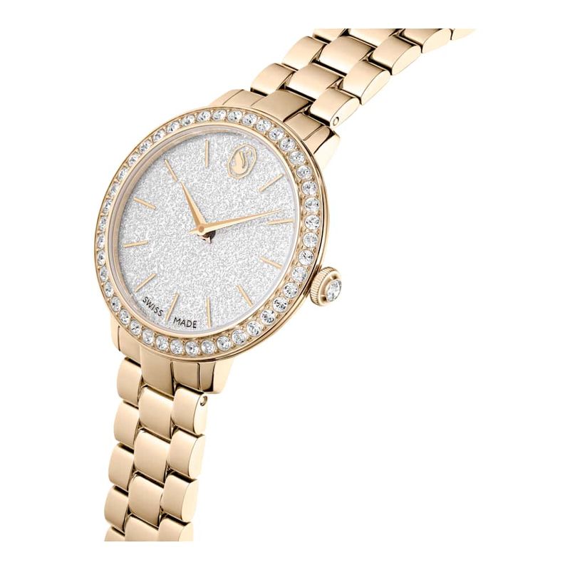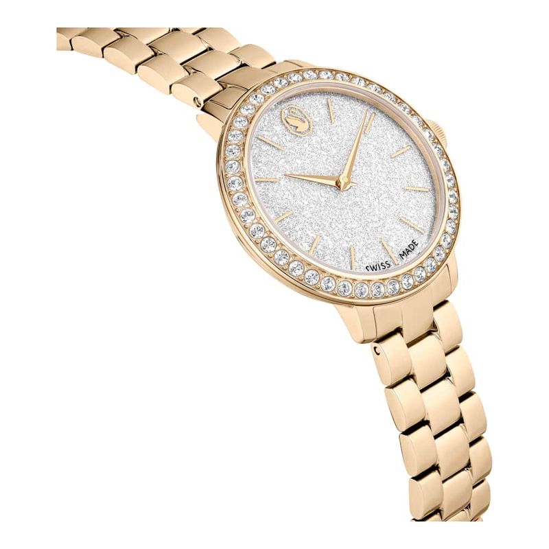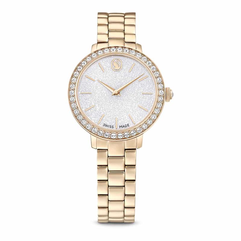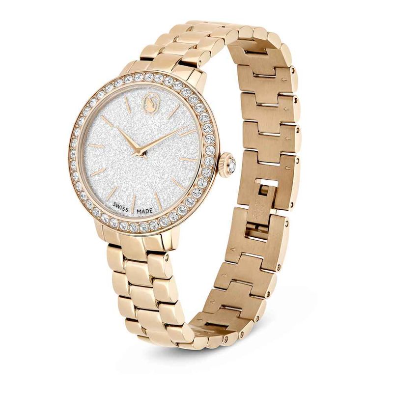 Inspired by Swarovski’s Matrix jewels, this 30mm watch captures the same contemporary and expressive style. The stainless steel design has a champagne gold-tone finish and features a pavé-set bezel with 42 crystals. The beautiful round dial has a sparkling effect and includes fine hour markers and hands, as well as the swan logo at 12 o’clock. Along with an additional crystal set in the crown, this watch stands out with its three-link bracelet, which glides elegantly around the wrist. This Swiss-made watch is water-resistant to 50 meters and is the perfect companion for any occasion.