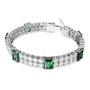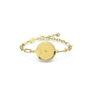 This starry bracelet is a beautiful way to connect with the universe and celebrate the Leo zodiac sign. A gold-tone plated coin is surrounded by a link bracelet designed especially for this family. On one side of the coin, the Leo constellation is encrusted in crystals on a glittering background and surrounded by a circle of sparkling pavé, while the other side features “Leo” engraved on a sandblasted background with a single green stone in the center surrounded by a circle of shimmering pavé. The intricate details of this piece evoke a mystical and magical feeling. It would make a very meaningful gift for yourself or someone special.